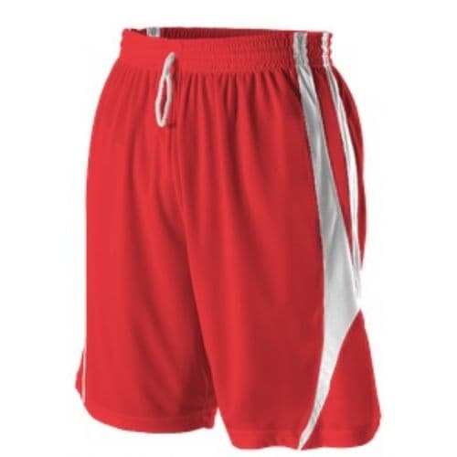 Alleson Adult Reversible Basketball Short 100% Extreme mock mesh Cationic Colorfast Polyester with moisture management fibers. Two color, double ply, fully reversible jersey and short. Short has 2" reversible elastic waistband and inside drawcord. Adult inseams: S(8"), M(9"), XL-3XL(10"). Youth inseam: 7".