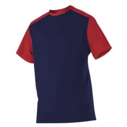 Alleson Crew Neck Baseball Jersey 100% Cationic Diamond Mock Mesh Cationic Polyester. Solid color diamond body with contrast color modified raglan yoke and set-in sleeves. Contrast color self-material, set-in collar for comfort and appearance. Straight hemmed bottom and sleeves.
