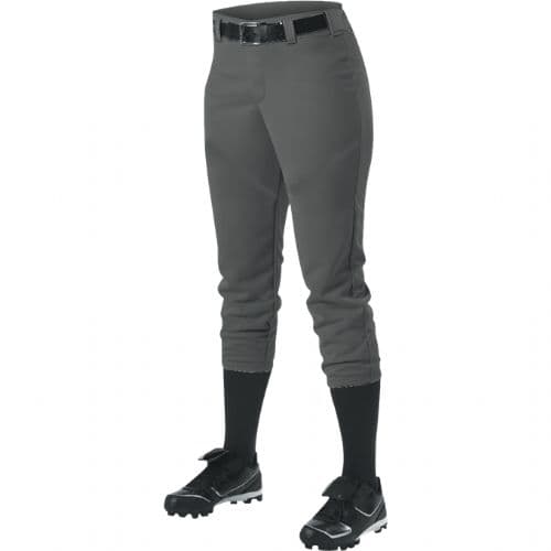 Alleson Girl's Crush Fastpitch Pant 100% DURA-Stretch 14oz double-knit polyester. Low rise women’s cut with mid-calf length pant with covered elastic bottom. Double layer knee construction for enhanced sliding protection. 2 ½” Gripper elastic waistband for a secure uniform fit. 7 pro-style belt loops. Zipper fly two snap closure.