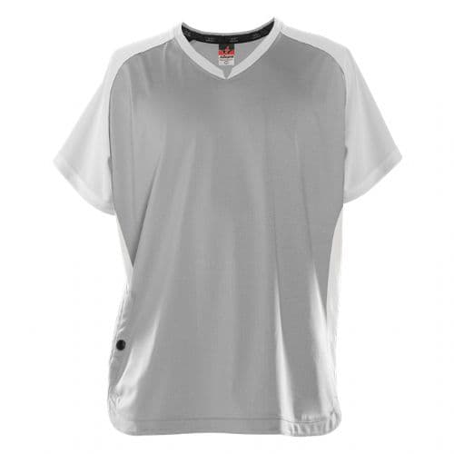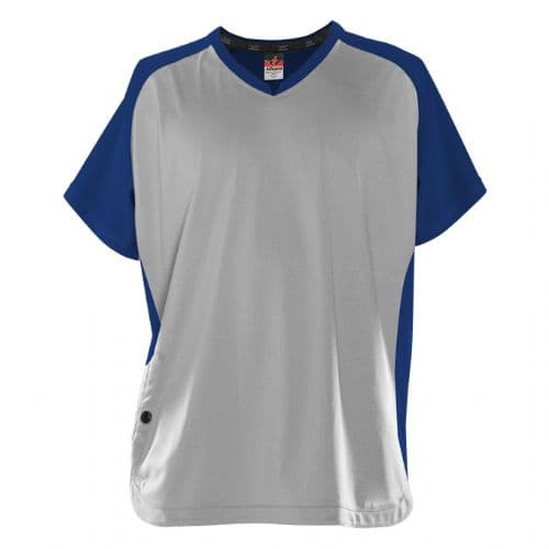 Alleson Short Sleeve Cage Batters Jacket 95% Polyester / 5% Spandex Soft-Tec Colorfast front and back body and side panels. 100% Colorfast Polyester Interlock contrast color sleeve. Collar and side panels. Modified V- Neck for comfort and appearance. Right side front pocket with button to hold items during wearing. Scoop bottom.
