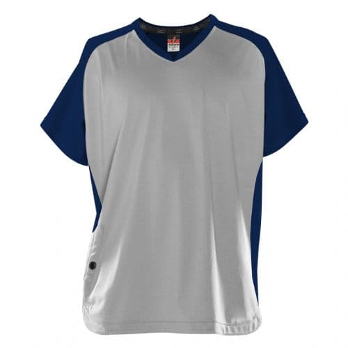 Alleson Short Sleeve Cage Batters Jacket 95% Polyester / 5% Spandex Soft-Tec Colorfast front and back body and side panels. 100% Colorfast Polyester Interlock contrast color sleeve. Collar and side panels. Modified V- Neck for comfort and appearance. Right side front pocket with button to hold items during wearing. Scoop bottom.