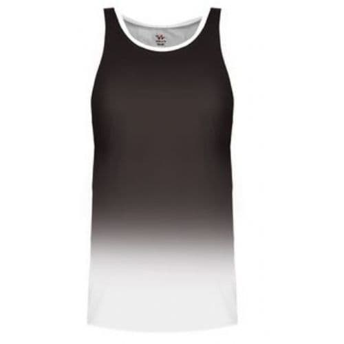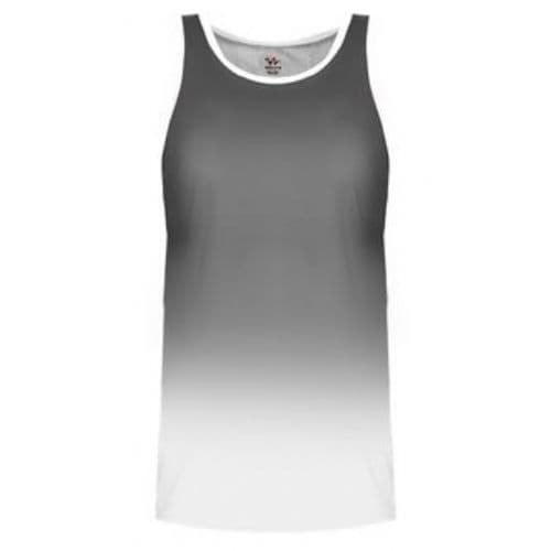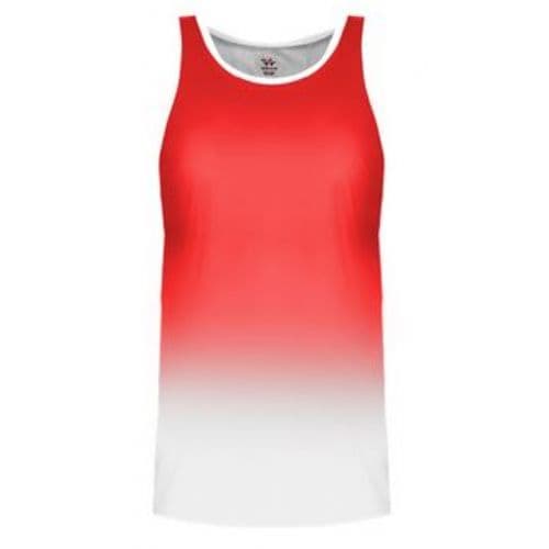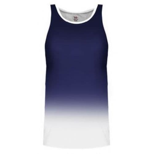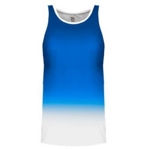 Alleson Women's Ombre Track Singlet 100% Polyester moisture management/antimicrobial performance fabric. Single ply tank body. Ombre color body coming from top of singlet cascading down to white to the bottom. White self-material trim around armholes. Straight cover hemmed bottom.