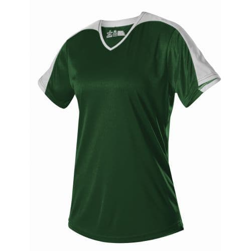 Alleson Women's V-Neck Softball Jersey 100% eXtreme microfiber Cationic Colorfast Polyester with moisture management fibers. Solid color eXtreme microfiber body and under sleeves. Sel-material, contrast color overlay on top of sleeves and yoke. Self-material, contrast color 1/2 V-Neck for appearance and comfort. Set-in short sleeves and collar. Hemmed sleeve ends and scoop bottom.