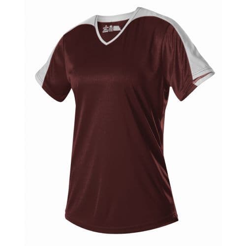 Alleson Women's V-Neck Softball Jersey 100% eXtreme microfiber Cationic Colorfast Polyester with moisture management fibers. Solid color eXtreme microfiber body and under sleeves. Sel-material, contrast color overlay on top of sleeves and yoke. Self-material, contrast color 1/2 V-Neck for appearance and comfort. Set-in short sleeves and collar. Hemmed sleeve ends and scoop bottom.