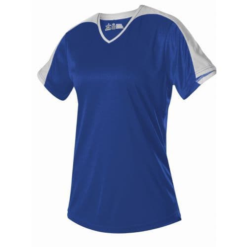 Alleson Women's V-Neck Softball Jersey 100% eXtreme microfiber Cationic Colorfast Polyester with moisture management fibers. Solid color eXtreme microfiber body and under sleeves. Sel-material, contrast color overlay on top of sleeves and yoke. Self-material, contrast color 1/2 V-Neck for appearance and comfort. Set-in short sleeves and collar. Hemmed sleeve ends and scoop bottom.