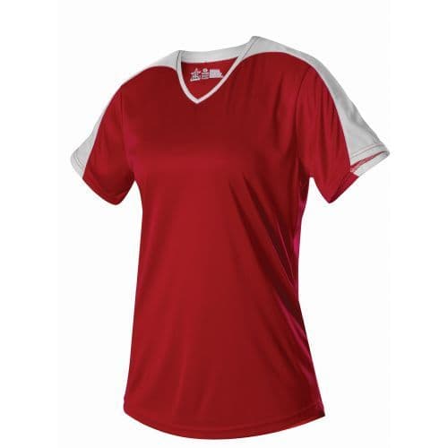 Alleson Women's V-Neck Softball Jersey 100% eXtreme microfiber Cationic Colorfast Polyester with moisture management fibers. Solid color eXtreme microfiber body and under sleeves. Sel-material, contrast color overlay on top of sleeves and yoke. Self-material, contrast color 1/2 V-Neck for appearance and comfort. Set-in short sleeves and collar. Hemmed sleeve ends and scoop bottom.