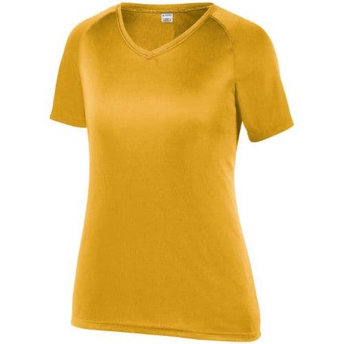 Augusta Ladies' Attain Wicking Shirt 100% polyester wicking knit with true hue technology® that helps prevent dye migration. Wicks moisture. Ladies’ fit. Tear away label. Raglan sleeves.