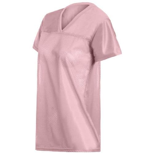 Augusta Ladies' Jr. Fit Replica Football Tee 4.4 ounce 100% polyester tricot mesh. 2.2 ounce 100% polyester dazzle fabric yoke and sleeves. Ladies' fit. Outside locker label. V-neck collar. Side vents. Not to be worn with pads. Front and back yoke large enough for embellishment. Set-in sleeves.
