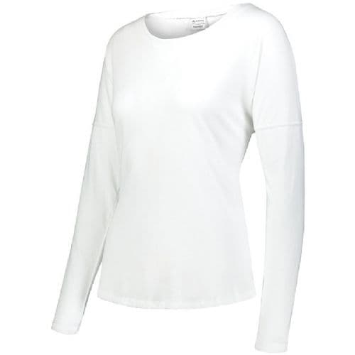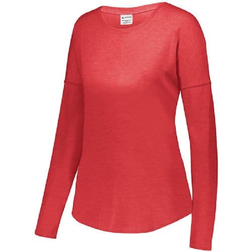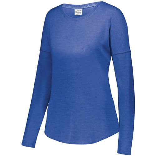 Augusta Ladies' Lux Tri-Blend Long Sleeve Crew The extra soft Ladies Lux Tri-Blend Long Sleeve Shirt is a perfect balance of cotton, rayon, and polyester. Featuring a brushed peach surface, this loose-fitting long sleeve T-shirt is an easy favorite. It features a contoured bottom hem and dropped shoulder sleeves for mobility and comfort. Go beyond the basic with this luxurious tee. 3.8 ounce, 50% polyester/38% cotton/12% rayon tri-blend knit. Ladies' fit. Fits loose to body. Tear away label. Scoop neck. Dropped shoulder sleeves for mobility and comfort. Contoured bottom.