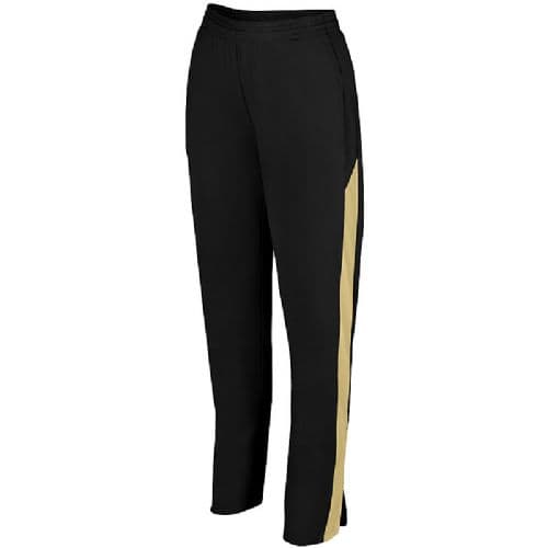 Augusta Ladies' Medalist Pant 2.0 Heavyweight 100% Polyester matte brushed tricot. Ladies' fit. Heat sealed label. Covered elastic waistband with inside drawcord. Side seam pockets. Back yoke. Contrast color side inserts. Zipper on outside lower leg.