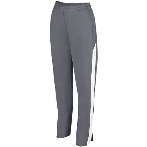 Augusta Ladies' Medalist Pant 2.0 Heavyweight 100% Polyester matte brushed tricot. Ladies' fit. Heat sealed label. Covered elastic waistband with inside drawcord. Side seam pockets. Back yoke. Contrast color side inserts. Zipper on outside lower leg.