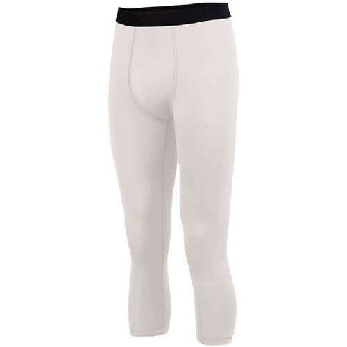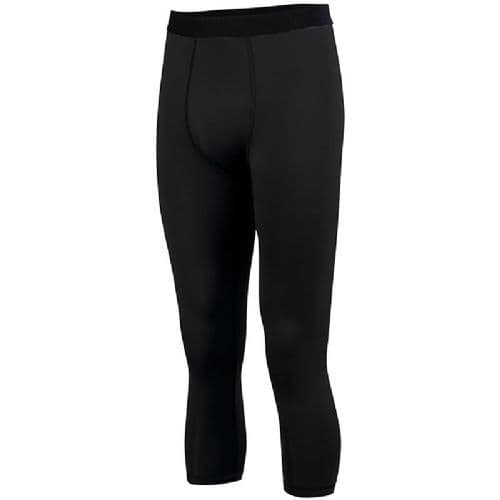 Augusta Men's Hyperform Compression Calf Length Tight 84% Polyester/16% Spandex knit. Wicks Moisture. Odor resistant. Ultra tight fit. Pad print label. Soft brushed back exposed elastic waistband provides comfort. 4-Way stretch fabric allows for greater mobility and maintains shape. Flatlock stitching provides comfort and resists chafing.