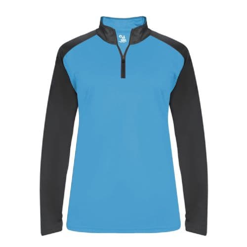Badger Ladies Ultimate Sport 1/4 Zip 100% Soft Polyester Moisture Management/Antimicrobial Performance Fabric. UVA and UVB sun protection in areas covered by the shirt (UPF 50+). Super soft interlock fabric for comfort. Self-fabric collar with 7" locking zipper. Double-needle hemmed bottom. Badger heat seal logo on left sleeve.