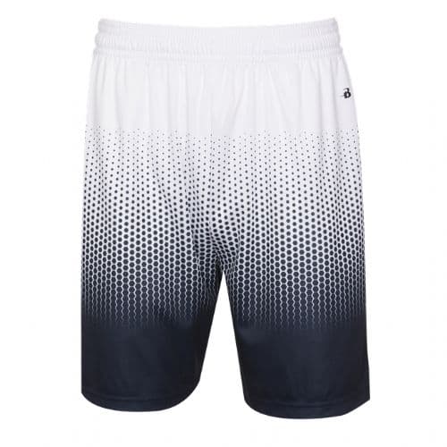 Badger Men's 2.0 Hex Short 100% Sublimated Polyester moisture management/ antimicrobial performance fabric. Athletic cut & superior fit. 2" Covered elastic waistband & drawcord. Two deep side seam pockets. Double-needle hem. Badger heat seal logo on left hip.