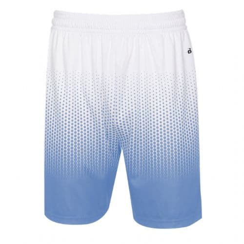 Badger Men's 2.0 Hex Short 100% Sublimated Polyester moisture management/ antimicrobial performance fabric. Athletic cut & superior fit. 2" Covered elastic waistband & drawcord. Two deep side seam pockets. Double-needle hem. Badger heat seal logo on left hip.