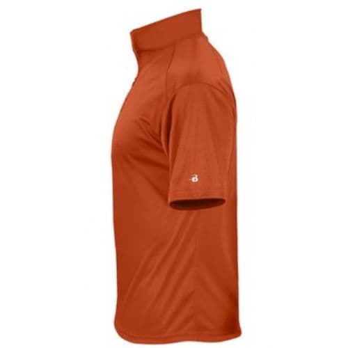 Badger Men's B-Core Short Sleeve 1/4 Zip 100% Polyester Moisture Management fabric. Self-fabric collar with 7" locking zipper. Contrast zipper and inner collar. Badger sport shoulder for maximum movement with cover stitch. Double-needle hemmed bottom. Badger Heat seal logo on left sleeve.