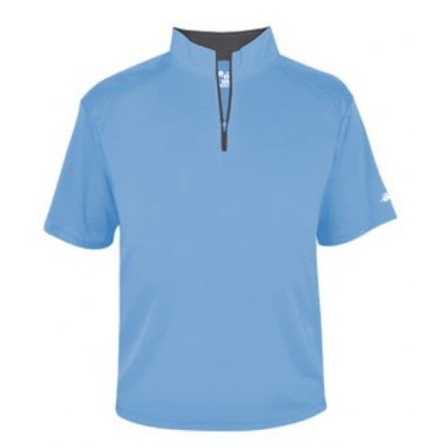 Badger Men's B-Core Short Sleeve 1/4 Zip 100% Polyester Moisture Management fabric. Self-fabric collar with 7" locking zipper. Contrast zipper and inner collar. Badger sport shoulder for maximum movement with cover stitch. Double-needle hemmed bottom. Badger Heat seal logo on left sleeve.