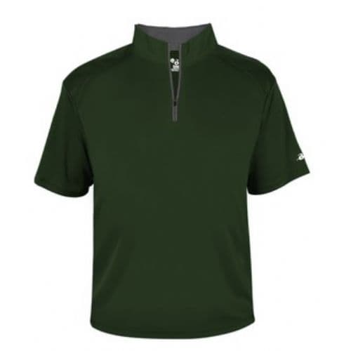 Badger Men's B-Core Short Sleeve 1/4 Zip 100% Polyester Moisture Management fabric. Self-fabric collar with 7" locking zipper. Contrast zipper and inner collar. Badger sport shoulder for maximum movement with cover stitch. Double-needle hemmed bottom. Badger Heat seal logo on left sleeve.