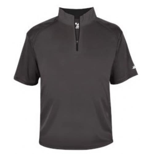 Badger Men's B-Core Short Sleeve 1/4 Zip 100% Polyester Moisture Management fabric. Self-fabric collar with 7" locking zipper. Contrast zipper and inner collar. Badger sport shoulder for maximum movement with cover stitch. Double-needle hemmed bottom. Badger Heat seal logo on left sleeve.