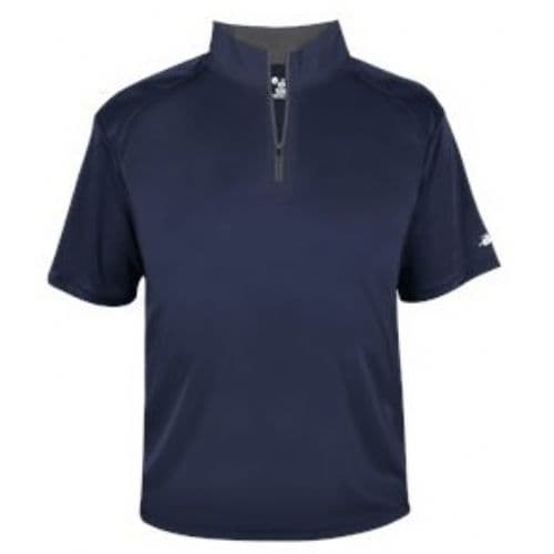 Badger Men's B-Core Short Sleeve 1/4 Zip 100% Polyester Moisture Management fabric. Self-fabric collar with 7" locking zipper. Contrast zipper and inner collar. Badger sport shoulder for maximum movement with cover stitch. Double-needle hemmed bottom. Badger Heat seal logo on left sleeve.