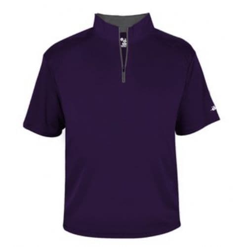 Badger Men's B-Core Short Sleeve 1/4 Zip 100% Polyester Moisture Management fabric. Self-fabric collar with 7" locking zipper. Contrast zipper and inner collar. Badger sport shoulder for maximum movement with cover stitch. Double-needle hemmed bottom. Badger Heat seal logo on left sleeve.