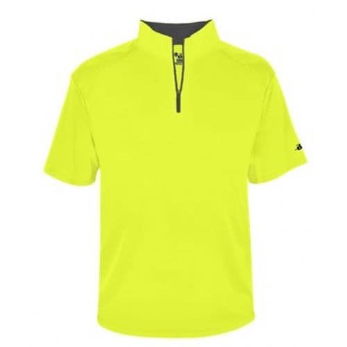 Badger Men's B-Core Short Sleeve 1/4 Zip 100% Polyester Moisture Management fabric. Self-fabric collar with 7" locking zipper. Contrast zipper and inner collar. Badger sport shoulder for maximum movement with cover stitch. Double-needle hemmed bottom. Badger Heat seal logo on left sleeve.