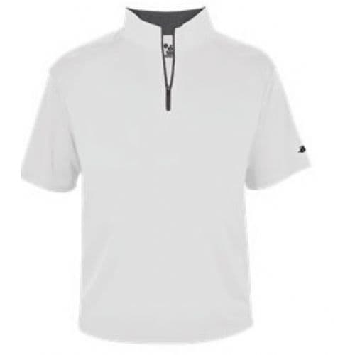 Badger Men's B-Core Short Sleeve 1/4 Zip 100% Polyester Moisture Management fabric. Self-fabric collar with 7" locking zipper. Contrast zipper and inner collar. Badger sport shoulder for maximum movement with cover stitch. Double-needle hemmed bottom. Badger Heat seal logo on left sleeve.