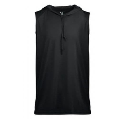 Badger Men's B-Core Sleeveless Hood Tee 100% Polyester Moisture Management/antimicrobial performance fabric. Badger sport shoulder for maximum movement. Self-fabric hood. No drawcord in hood. Double-needle hem. Badger heat seal logo on lower left front body.