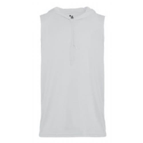 Badger Men's B-Core Sleeveless Hood Tee 100% Polyester Moisture Management/antimicrobial performance fabric. Badger sport shoulder for maximum movement. Self-fabric hood. No drawcord in hood. Double-needle hem. Badger heat seal logo on lower left front body.