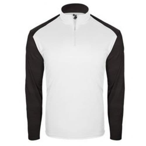 Badger Men's Breakout 1/4 Zip 100% Sublimated Polyester moisture management/ antimicrobial performance fabric. Contrast textured shoulders and sleeves. Self-fabric collar with 8” locking zipper. Badger sport shoulder for maximum movement. Self-fabric collar. Double-needle hem. Badger heat seal logo on left sleeve.