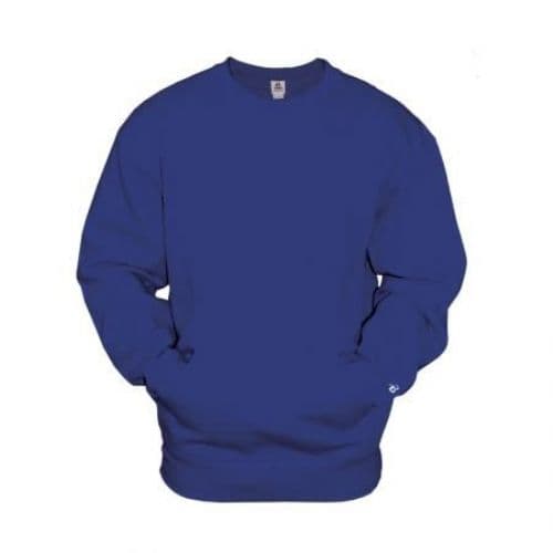 Badger Men's Crew Neck With Pouch Pocket Twill taped neckline. Badger sport paneled shoulder for maximum movement. 9.5 oz. Ringspun 60% Cotton/ 40% Polyester. Spandex reinforced rib knit cuffs and waistband. Front pouch pocket with headset opening. Embroidered badger logo on left sleeve. V-Patch front and half moon back with room for embellishment.
