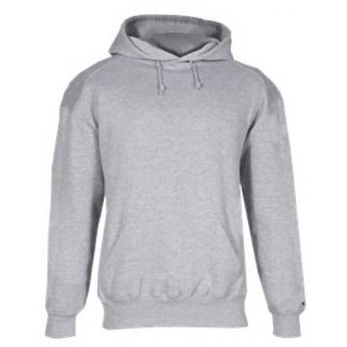 Two-ply hood with drawcord. Spandex reinforced rib knit cuffs and waistband. Pouch front pocket with headset opening. Embroidered Badger logo on left sleeve cuff.