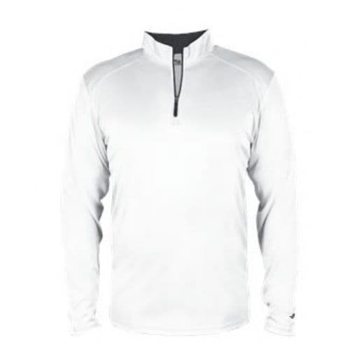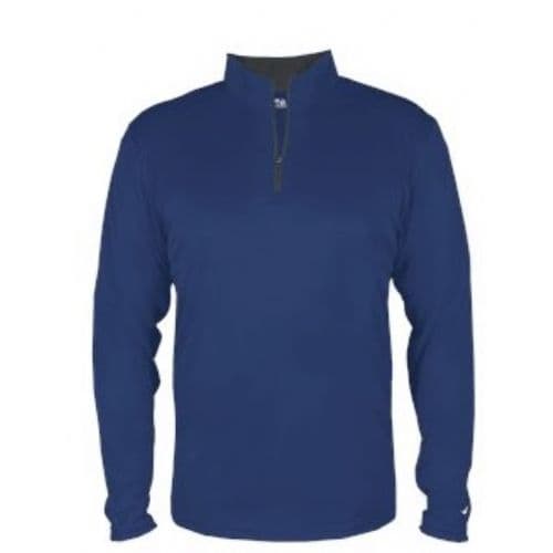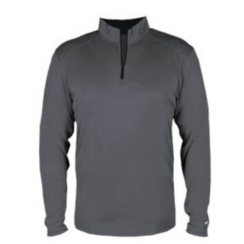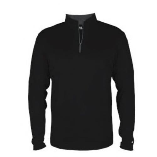 100% Polyester moisture management/antimicrobial fabric. Self-fabric collar with 7" locking zipper - Contrast zipper & inner collar. Badger sport paneled shoulder for maximum movement with coverstitch. Badger heat seal logo on left sleeve.