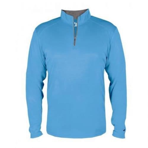 100% Polyester moisture management/antimicrobial fabric. Self-fabric collar with 7" locking zipper - Contrast zipper & inner collar. Badger sport paneled shoulder for maximum movement with coverstitch. Badger heat seal logo on left sleeve.