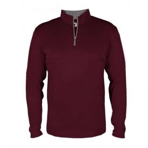100% Polyester moisture management/antimicrobial fabric. Self-fabric collar with 7" locking zipper - Contrast zipper & inner collar. Badger sport paneled shoulder for maximum movement with coverstitch. Badger heat seal logo on left sleeve.