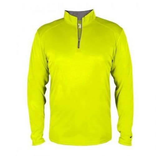 100% Polyester moisture management/antimicrobial fabric. Self-fabric collar with 7" locking zipper - Contrast zipper & inner collar. Badger sport paneled shoulder for maximum movement with coverstitch. Badger heat seal logo on left sleeve.