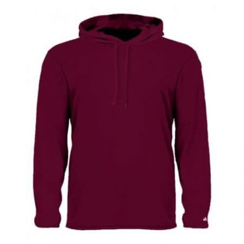 100% Polyester moisture management/antimicrobial fabric. Badger sport shoulder for maximum movement. Self-fabric hood. Badger heat seal logo on left sleeve. No drawcord on youth garments.