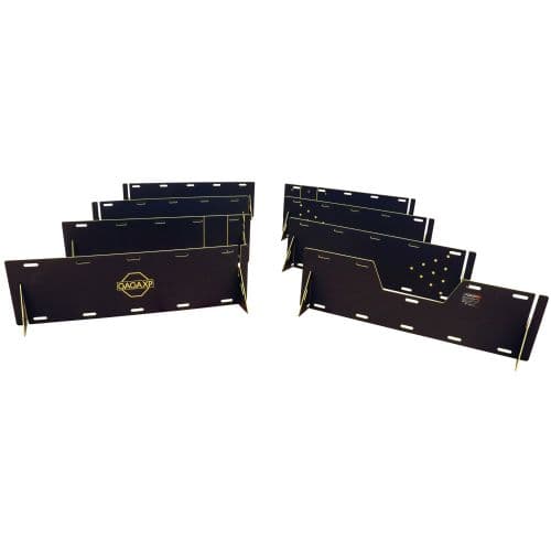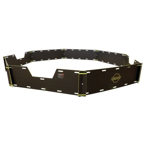 GAGAXP GAGA PIT Our original pit design features eight panels: five solid panels and three door panels with built-in handles that make it easy to move around. Each panel measures 27” x 96” x ½”, and weighs approximately 40 lbs, featuring slotted ends for easy assembly. At around 18 feet in size from corner to corner, our GagaXP pit comes with 16 rubber footings, and 16 panel stands, providing you with everything you need for an incredible gaga ball game!