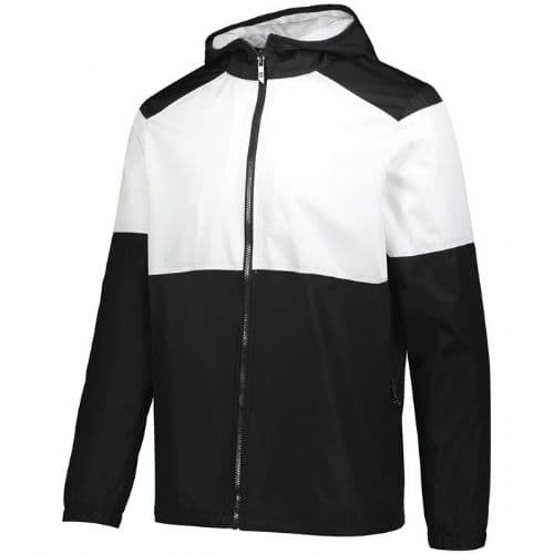 Holloway Men's SeriesX Jacket Micron™ polyester is a lightweight, wind/water-resistant fabric. 100% polyester micromesh lining. Embossed inserts for subtle textured pattern. Woven label. Front zipper. 3-piece hood with spandex binding. Set-in sleeves. Front zippered pockets. Elastic cuffs. Adjustable bottom hem with hidden shockcord closure in right pocket (on Adult).