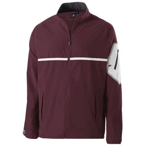 Holloway Men's Weld Full Zip Jacket Stretch woven is a 90% Polyester/10% Spandex with 4-way stretch. Raglan sleeves. Locking welt front pockets. Reflective metallic welded Silicone arm zippered pocket with Silicone media port. Spandex bound cuff. Dual inside pockets. Adjustable hem with hidden drawcord system. Classic fit.