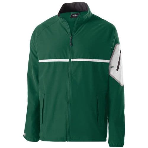 Holloway Men's Weld Full Zip Jacket Stretch woven is a 90% Polyester/10% Spandex with 4-way stretch. Raglan sleeves. Locking welt front pockets. Reflective metallic welded Silicone arm zippered pocket with Silicone media port. Spandex bound cuff. Dual inside pockets. Adjustable hem with hidden drawcord system. Classic fit.