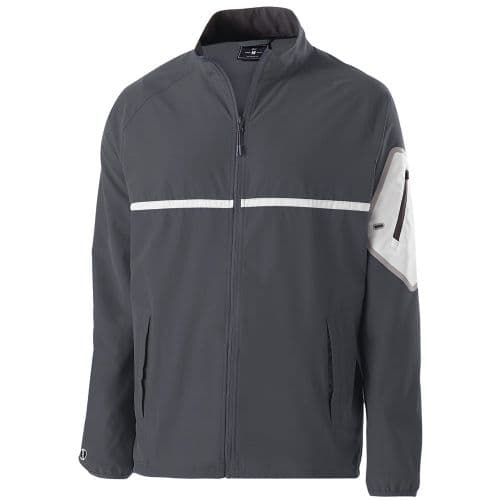 Holloway Men's Weld Full Zip Jacket Stretch woven is a 90% Polyester/10% Spandex with 4-way stretch. Raglan sleeves. Locking welt front pockets. Reflective metallic welded Silicone arm zippered pocket with Silicone media port. Spandex bound cuff. Dual inside pockets. Adjustable hem with hidden drawcord system. Classic fit.