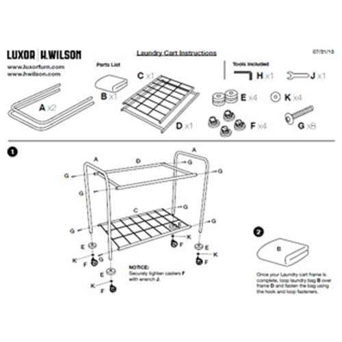 Bag is constructed of heavy duty canvas and removes easily with hook and loop fasteners Inside of the tan bag is one large compartment Chrome plated steel frame Load capacity: 7 bushels, 51 gallons, 100 lbs. Support bars under bag 2½" casters, two with brake and 4 caster bumpers Outer dimensions: 36½"H x 38½"W x 24¾"D Inner dimensions: 23"H x 30½"W x 19½"D Assembly required