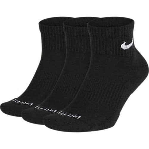 Nike 3 PPK Everyday Dri-FIT Cushion Quarter Socks Cushioned, medium-density padding/impact absorption. Dri-FIT fabric wicks away moisture to keep feet dry and cool. Arch support with a snug, secure fit. Anatomical Left and Right. Superior fit and cushioning.