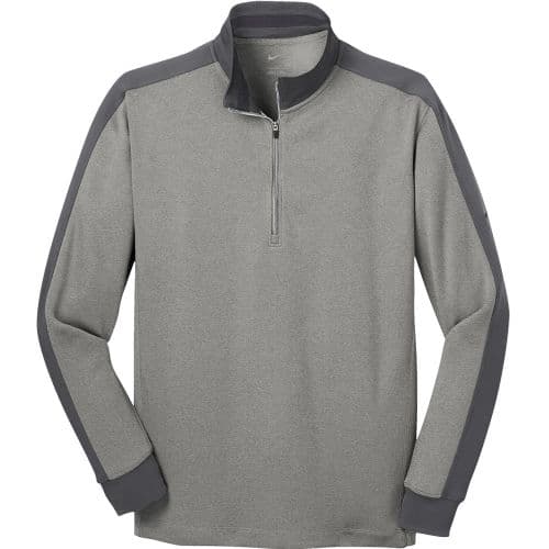 Nike Men's Dri-FIT 1/2 Zip Pullover A boldly striped inner collar and reverse coil zipper give this cover-up an edge. Of course, it also performs with Dri-FIT moisture management technology. The design features a flat knit collar and cuffs and an open hem. The contrast Swoosh design trademark is embroidered on the upper left sleeve. Made of 8.3-ounce, 100% Dri-FIT polyester.