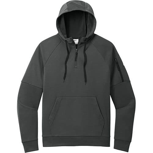 Nike Men's Therma-FIT Pocket 1/4-Zip Fleece Hoodie This 1/4-zip hoodie with a zippered left arm pocket brings the heat to your workout with Therma-FIT fabric. Therma-FIT helps manage your body’s natural heat to keep warm in cold-weather conditions. The design includes a three-panel hood with black drawcords, a dyed-to-match zipper and a front pouch pocket. Self-fabric cuffs and hem. A contrast Swoosh logo is embroidered on left sleeve. A contrast Therma-FIT logo is embroidered on back hem. Made of 7.4-ounce polyester Therma-FIT fabric.