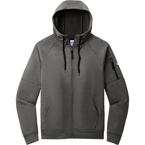 Nike Men's Therma-FIT Pocket Full-Zip Fleece Hoodie This full-zip hoodie with a zippered left arm pocket brings the heat to your workout with Therma-FIT fabric. Therma-FIT helps manage your body’s natural heat to keep warm in cold-weather conditions. The design includes a three-panel hood with black drawcords, a dyed-to-match zipper and front pockets. Self-fabric cuffs and hem. A contrast Swoosh logo is embroidered on left sleeve. A contrast Therma-FIT logo is embroidered on back hem. Made of 7.4-ounce polyester Therma-FIT fabric.
