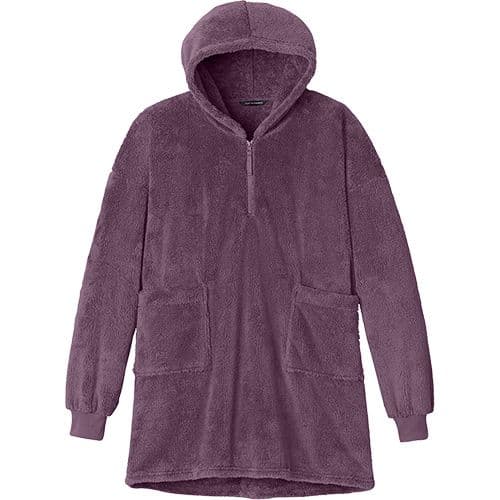 This two-sided brushed fleece poncho is simply fluffy and fun. Perfect for lounging, it offers a warm retreat any time of year.