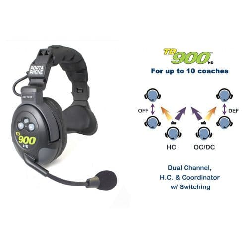 The Porta Phone TD 900 HD Double Channel series set a new standard for high school, college and university coaching staffs that require an Offense / Defense talking pattern. These heavy-duty headsets feature rugged components and extra wide padding making them both durable and comfortable.