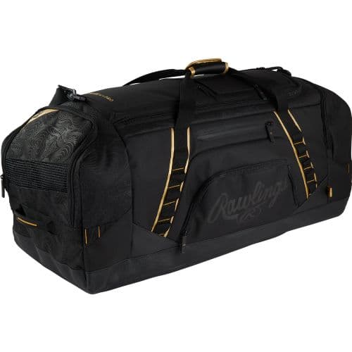 RAWLINGS GOLD COLLECTION XL DUFFEL BLACK The Rawlings Gold Collection XL Duffel is essential for coaches and catchers who are ready to suit up and hit the diamond! This duffel contains a dedicated two-glove storage compartment as well as internal bat storage that can fit up to six bats – plenty of space for all of your gear. Also, it contains ventilated internal shoe storage to ensure your cleats stay dry and ready to go for any doubleheader or tournament weekend. Additionally, the bag has five top/side pockets for accessories storage to secure any valuables you might have with you. On top of that, it has an XL main compartment including 2 large mesh pockets for easy access to gear, enough room to fit adult-sized catchers gear AND MORE! Lastly, it has a fully structured and easy-to-clean PVC bottom material, which is essential to keep your bag in flawless condition. This bag is ideal for baseball storage, and it has a sleek and stylish design! It includes our iconic Gold Glove accents and materials for the perfect contrast to the primary black style. Plus, traditional Heart of the HideⓇ Speed Shell Material to reduce weight and improve durability. We also included a removable decoration panel for peak customization, a great spot for your personal team logo. The Gold Collection XL Duffel is crucial for any competitive coaches or catchers in need of an elite bag with extensive storage. Get yours today!